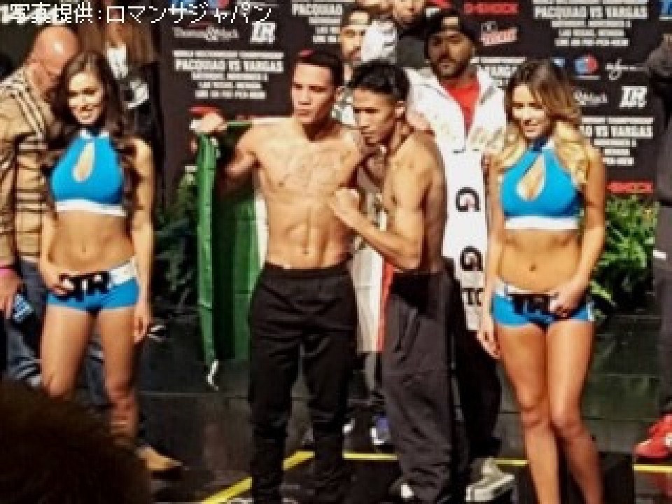 フィリピンの上院議員になって初の試合となるパッキャオは147ポンド(約66.6キロ)のウェルター級リミットを大きく割り込む144.8ポンド(約65.6キロ)で難なくパス。一方、3月の戴冠後、これが初防衛戦となるバルガスは146.5ポンド(約66.4キロ)だった。戦績はバルガスが28戦27勝(10KO)1敗、パッキャオは66戦58勝(38KO)6敗2分。6階級制覇の実績を持つパッキャオが勝てばウェルター級では3度目の戴冠となる。