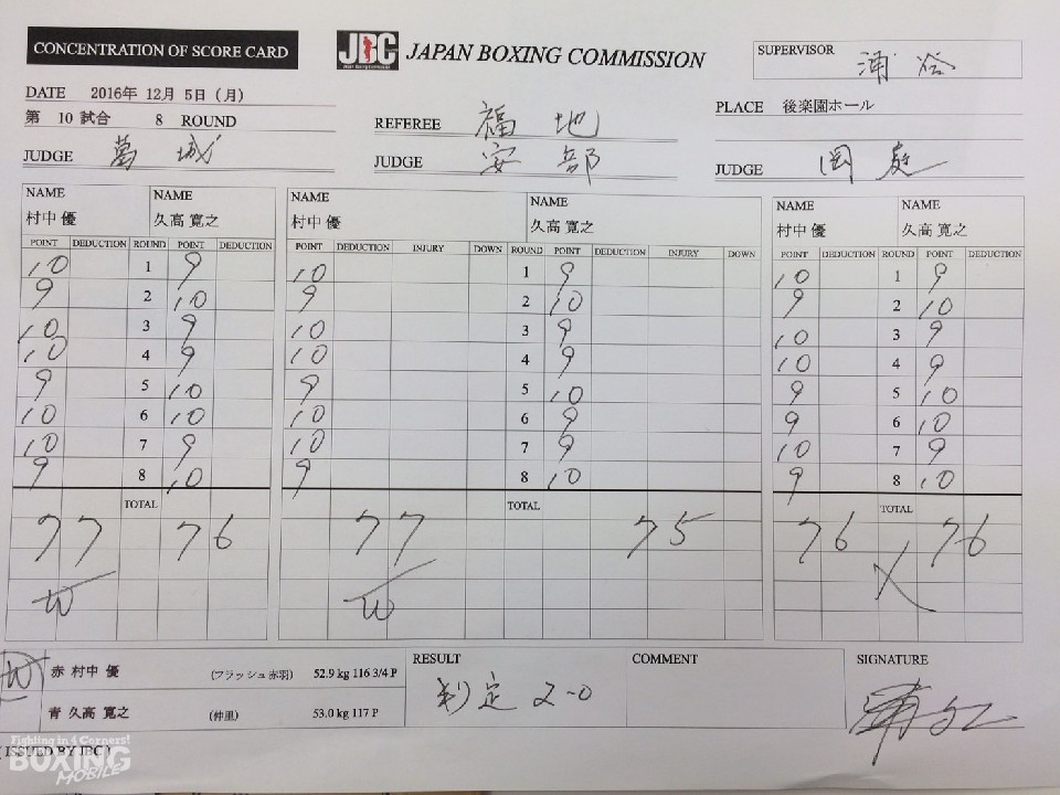 中盤を過ぎ、村中が失速したところで久高が左右をまとめ明確なポイントを取ったが、終盤は村中が再び盛り返して追撃を阻止。最終8回までどちらが倒れてもおかしくはないブローが交差した。ジャッジは1者がドローとするも、2者が小差で村中を支持。熟練同士の意地の張り合いは、村中に軍配が上がった。