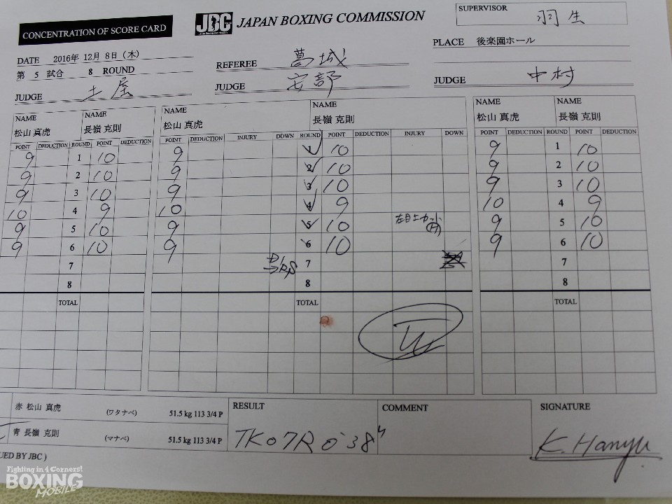 松山が距離を縮めてワンツーを狙うのに対し、長嶺は左フックを合わせた。その後は長嶺がワンツーを決めれば松山は右のショートをヒット。しかし、次第に長嶺のロングフックが顔面を捉える場面が増えていった。5ラウンドにヒッティングで左目上をカットした長嶺は続く回に左フックを決めダメージを与えると7ラウンドに左フックで腰を沈めると一気にスパート。松山陣営からタオルが投入された。