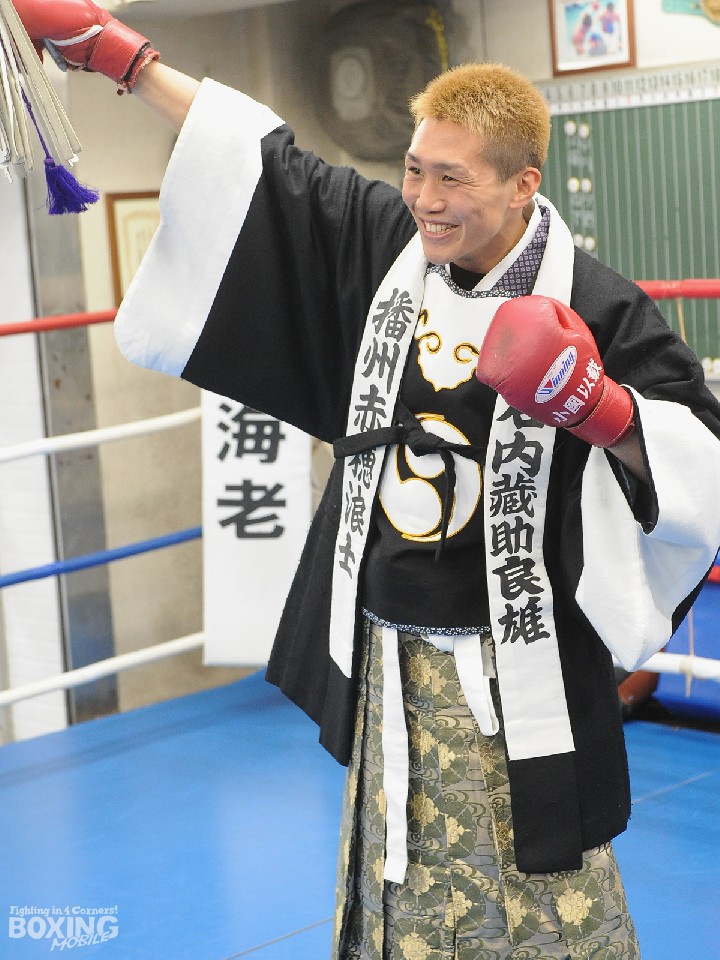大晦日の京都・島津アリーナでIBF世界スーパーバンタム級王者ジョナタン・グスマン(27=ドミニカ共和国)に挑戦する同級5位の小國以載(28=角海老宝石)が、都内の所属ジムで練習を公開。兵庫県赤穂市出身の小國は、忠臣蔵討ち入りの日でもある14日に合わせた四十七士の出で立ちで登場し「怪物退治じゃー!決死の覚悟で首を獲りに行く。今までやられた奴の敵を討ってやる」と気勢を上げた。