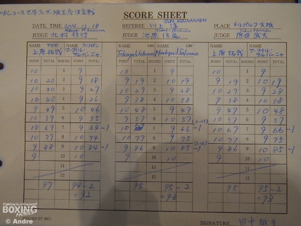 試合は、サウスポーの上原がジャブを連打で突きペースを握ると、左ストレートを上下に散らしポイントを重ねた。対して、サルバニアはノーモーションの右を強振し、1発のパンチにかける。サルバニアは再三のホールディングの注意で集中力をかくが上原は終始ペースを崩すことなく左ストレートでポイントアウト。最終ラウンドまで一度もペースを譲ることなく上原が試合を支配し初のタイトルを手中に収めた。