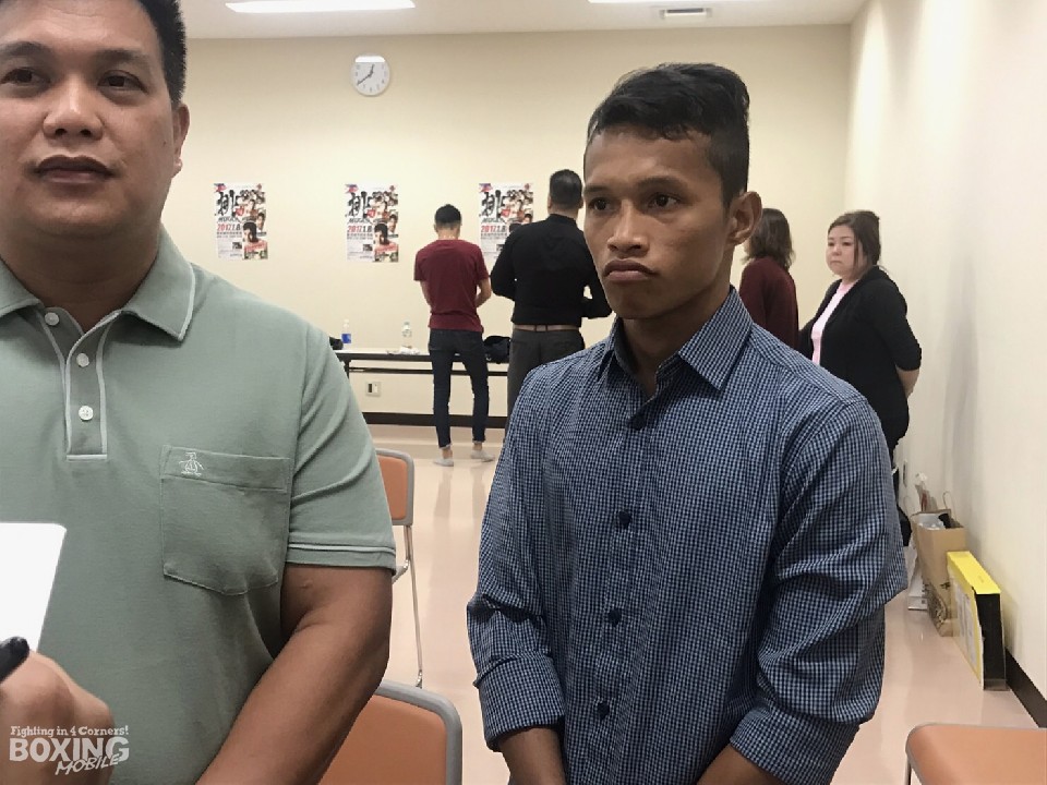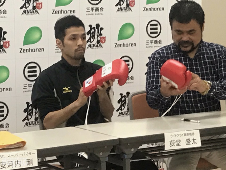 調印後のグローブチェックで赤色を選択した荻堂は「今回特に対策というものはやってないが、走り込みとスパー中心でやってきた。コンディションもかなり良い」と万全の仕上がりに自信をのぞかせた。初顔合わせしたレフジオに関して「思ったより小さいです。スタイルはアウトボクシングで逃げるタイプなので明日は自分が追って攻めていく展開になるだろう」と分析した。