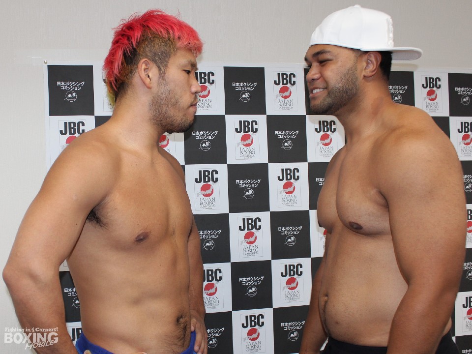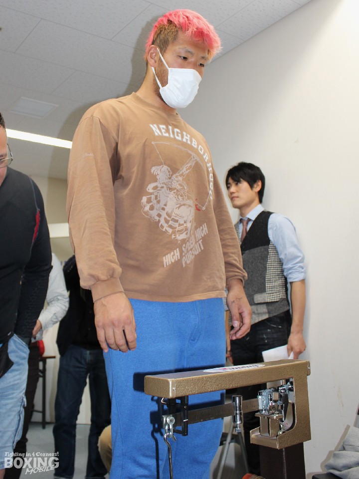 これが4年ぶり2度目のOPBF王座に挑戦する藤本は洋服を着たままで計量台に乗り103.0kgでパスした。「キックボクシングからボクシング界に転向した時から東洋のベルトは目標に掲げてきたで今回は絶対にベルトを獲りたい。アジア人にも(ヘビー級に)こんな選手がいるところを見てほしい。とにかく勝ちたい」と覚悟を持って試合に臨むと語った。昨年の大晦日に京都で行われた同門の小國以載の世界王座奪取を日帰りで観戦した藤本は「あんなにすごい試合の後に年明けに自分の試合があるのはやりずらい」と報道陣を笑いに誘ったが「自分も負けられないと刺激を受けた」と口にした。