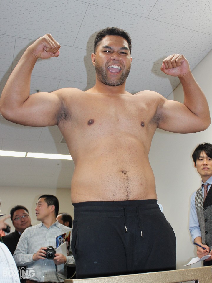 ニュージーランド生まれで国籍はオーストラリアのナッシオは118.8kgでクリア。元々ラグビーで活躍していたが、2012年にボクシングを始めたというナッシオは現在8連勝でタイトル戦を迎えた。終始上機嫌な様子で「藤本を3ラウンド以内に倒す」と高らかにKO宣言し会場を後にした。