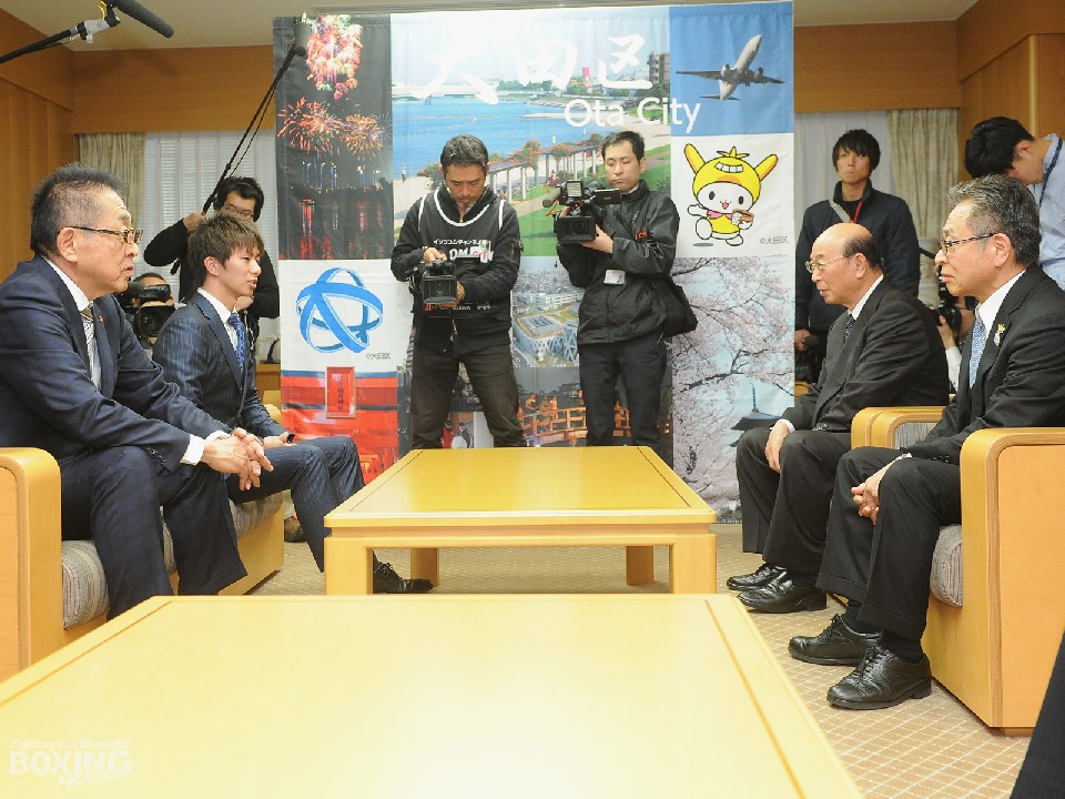 昨年の大晦日に都内の大田区総合体育館で、5度目の防衛に成功したWBA世界ライトフライ級王者の田口良一(30=ワタナベ)が18日、地元の大田区役所を表敬訪問し、松原忠義区長に防衛を報告した。田口は16戦全勝(13KO)のレコードを誇る同級3位のカルロス・カニサレス(23=ベネズエラ)を迎えたが、運動量と手数で勝る挑戦者を最後まで崩し切ることができず、三者三様の判定でドロー防衛となった。