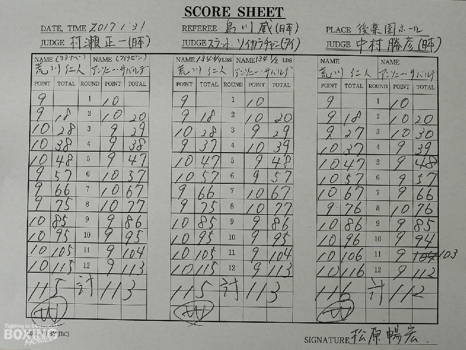 主導権を握った荒川は、終盤にかけて何度か連打でサバルデを追い込んだが、打たれ強い相手を崩し切ることができず。それでもジャッジ3者の支持を得て、判定3-0でWBOアジア・パシフィック王座を獲得した。