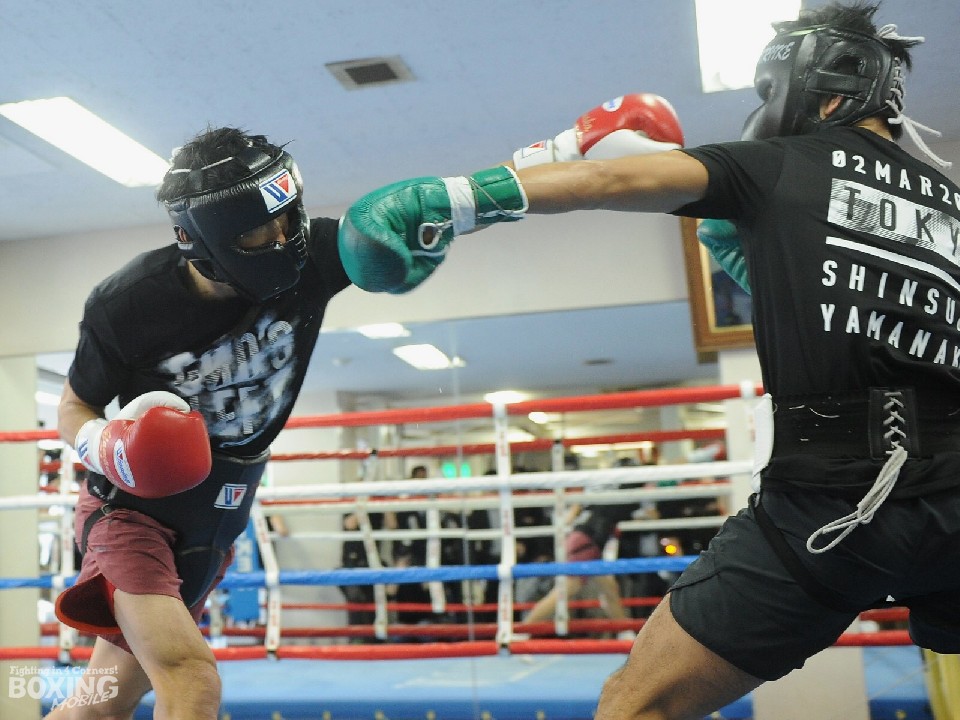 会見後には同門で2012年全日本スーパーバンタム級新人王の堀池雄大(32)と2ラウンドのスパーリングを披露。1回はジャブで圧力をかけると2分過ぎに左ストレートをヒット。2回にはセコンドの大和心トレーナーの「上下!」の指示が飛ぶなか、顔面とボディに左ストレートを叩き込んでパートナーを後退させた。これまで5〜6回ほど練習相手を務めてきたという堀池は「減量中のキツい時期なのにすごい動き。力を入れていないように見えるが、ピンポイントで急所を狙ってくるので気が抜けない。ボディへのパンチも効いたのでガードしていないと追いつかなかった。当日は倒して勝つと思う」と感想を口にした。