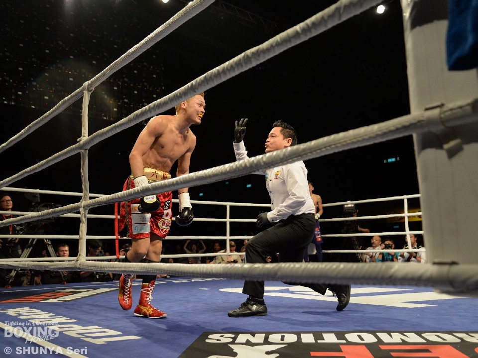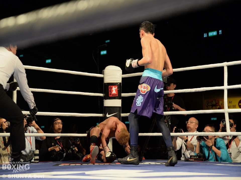 スーパーフライ級の地域タイトルなど3本を懸けて対戦した向井寛史(六島)と香港のスーパースター、レックス・ツォー(中国)。熱気と興奮に包まれた香港コンベンションセンター。ゴングが鳴ると即はじまった打ち合いの中で初回、向井が偶然のバッティングで左目上を負傷。早くも流血のハンデを負うこととなった。一方、レックスは地元の大声援に後押しされる中、ジャブとボディで距離を詰めて、向井をロープ際まで追い込む場面を作った。