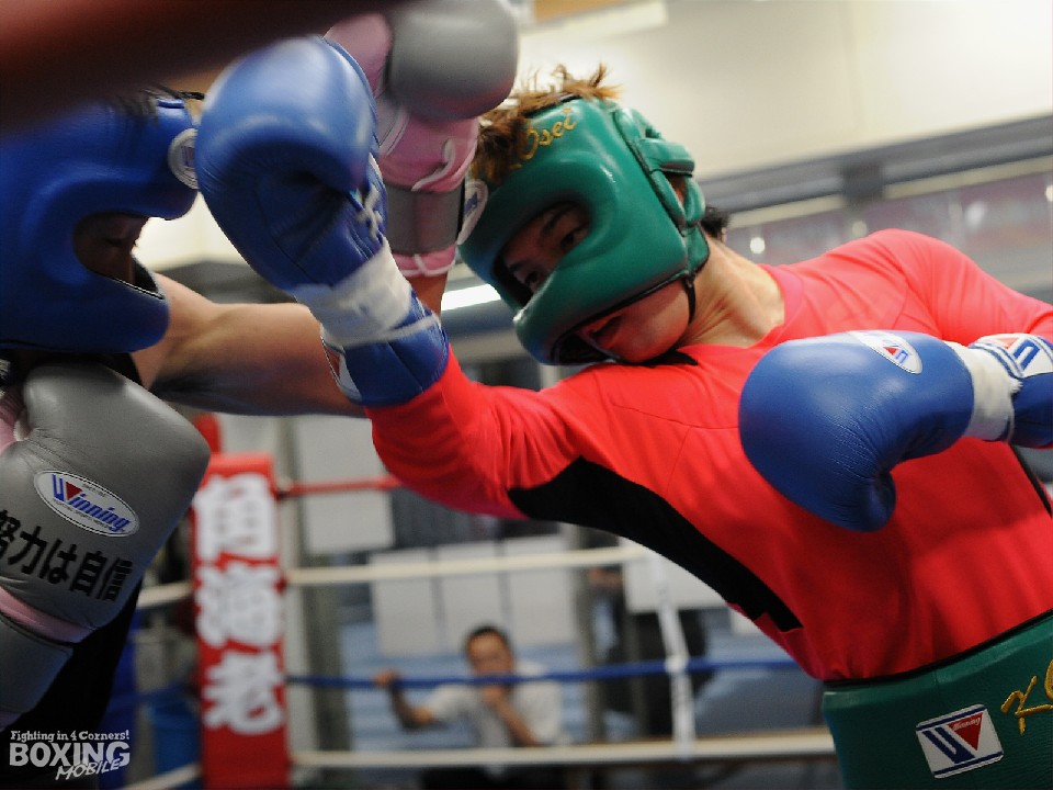 世界戦前の昨年11月にも同ジムへ出稽古に訪れている田中は、今回もタイプの違う階級上の選手と実戦練習を行い、力をつけて帰りたいとコメント。フットワークに長けカウンターを得意とする長嶺とのスパーでは、序盤から課題のガードを意識しながらプレッシャーをかけ、常に相手を正面に捉えて離さず。緩急をつけた攻撃から終盤は一気にギアを上げ、長嶺を連打で追い込んだ。
