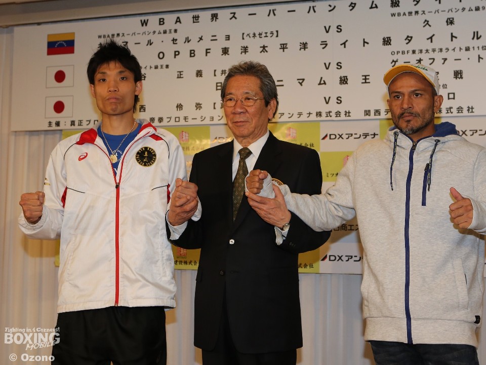 WBA世界スーパーバンタム級タイトルマッチに出場するチャンピオンのネオマール・セルメニョ(ベネズエラ)と、挑戦者の久保隼(真正)が7日、世界戦の調印式を行うため大阪市内のホテルに姿をみせた。徐々に高まる世界戦の緊張感。試合は2日後の4月9日(日)、エディオンアリーナ大阪(旧大阪府立体育会館)で、第1試合は午後1時ゴング予定。