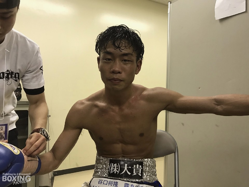 5ラウンド終了時の採点は2-0で谷口将隆がリードした。が、後半に入ると、小西伶弥がボディを打って優位に試合を進めた。結果は逆転!控え室に戻った新チャンピオンの小西は「前半は足を使おうと思ってたけど狙い過ぎました。後半は足を止めて打ち合うつもりでした。中盤からボディー効いてたのが分かって、公開採点でポイントが負けてても予定通りにいけました」と試合を振り返った。