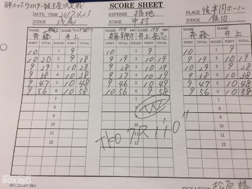 初回、斉藤が右ストレートを決めて好スタートを切ったが、2回以降は井上がフィジカルの強さを生かして左ボディ、左フックをヒット。斉藤も真っ向から打ち合う姿勢をみせて会場を沸かせた。前半終了時の公開採点は2者が48-47、1者が49-46で井上がリード。6回、リズムに乗った井上はプレスをかけて右フックをねじ込むと、斉藤は左目上をカット。7回、井上が力強いパンチで攻め立てると斉藤の目の状態を考慮したレフェリーが試合をストップした。井上がタイトル初挑戦で新王者に輝いた。