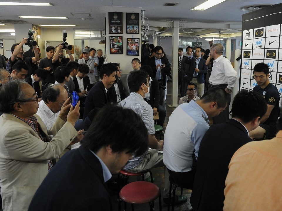 練習に先だって行われた会見では冒頭、帝拳プローション浜田剛史代表が「デビュー以来、最高のコンディションで世界戦を迎えることができる。今が一番強い」と期待すると、村田も「良い時期も悪い時期もあったが、それを乗り越えたからこそ今良い形になっている」と自信を示した。