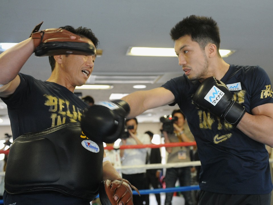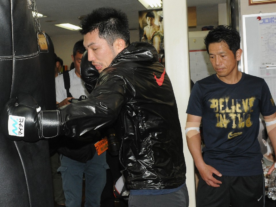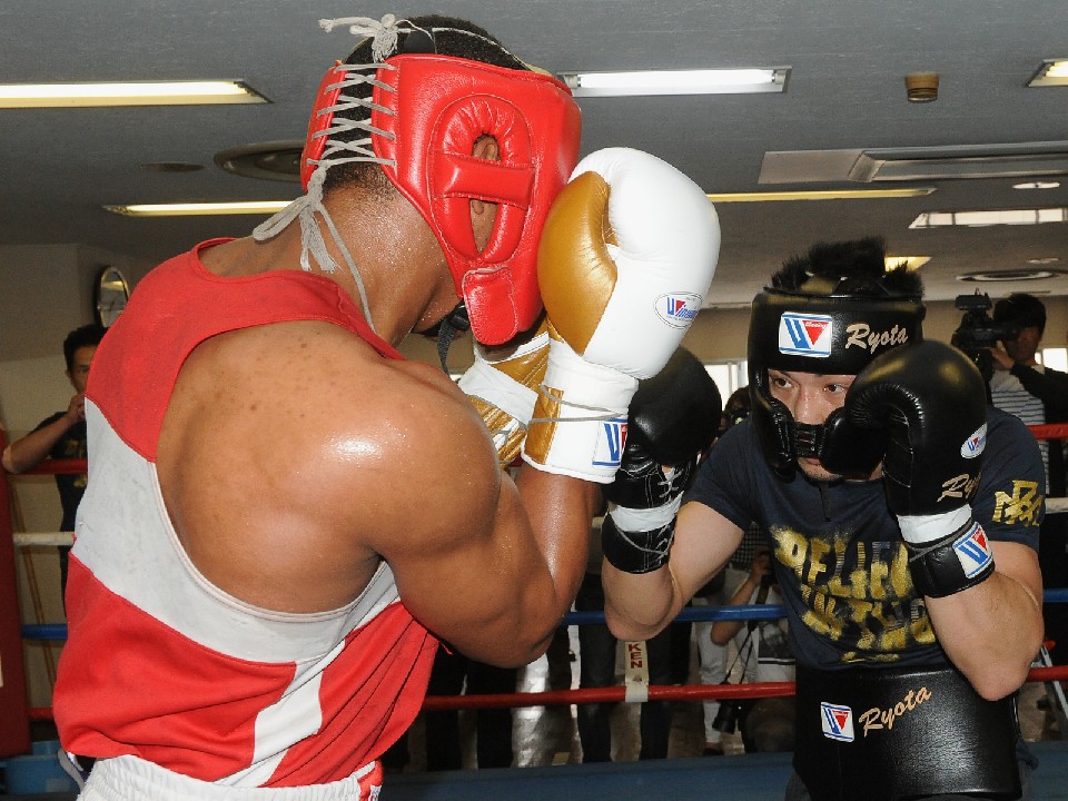 練習は軽めに終始したが、世界戦のために海外から呼び寄せたパートナーのひとり、パトリック・デイ(米)と2ラウンドのスパーリングを行い、初回は力が入り追いすぎたが、ポジションニングを意識した2回はワンツー、ボディで捉え、すぐさま修正する能力の高さを見せた。また、田中繊大トレーナーとのミット打ちでは、上下ブローの確認に時間を費やし、たっぷりと汗を流した。