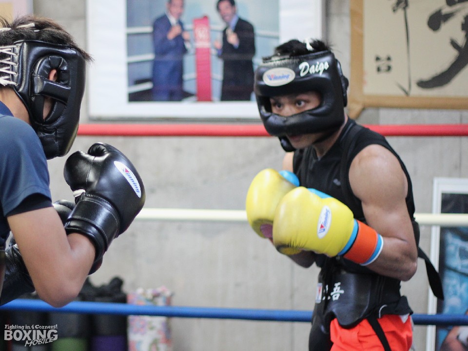 その後、同じ日に4回戦でデビュー戦を行う大湾硫斗(18)を相手に2ラウンドのスパーリングを披露。大湾に攻め込まれる場面もあったが、冷静にパンチを見切るとブロックで被弾を回避。途中、具志堅会長の「大吾!フェイント!誤魔化して」という指示が飛ぶ中、ジャブで距離を測り、鋭い踏み込みからワンツーを決めた。
