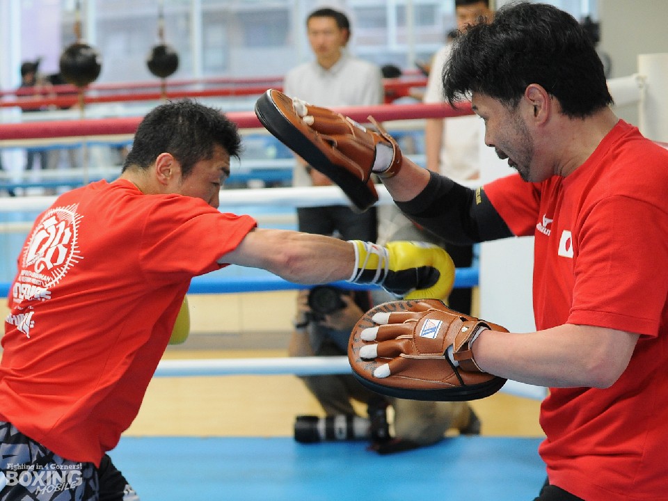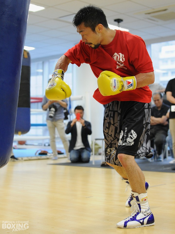 21日(日)の東京・有明コロシアムで暫定王者のミラン・メリンド(29=比)を迎え、IBF(国際ボクシング連盟)ライトフライ級王座の3度目の防衛戦を行う八重樫東(34=大橋)が13日、横浜市内の所属ジムで練習を公開。松本好二トレーナーとのミット打ちなどで精力的に汗を流し、好調さをアピールした。