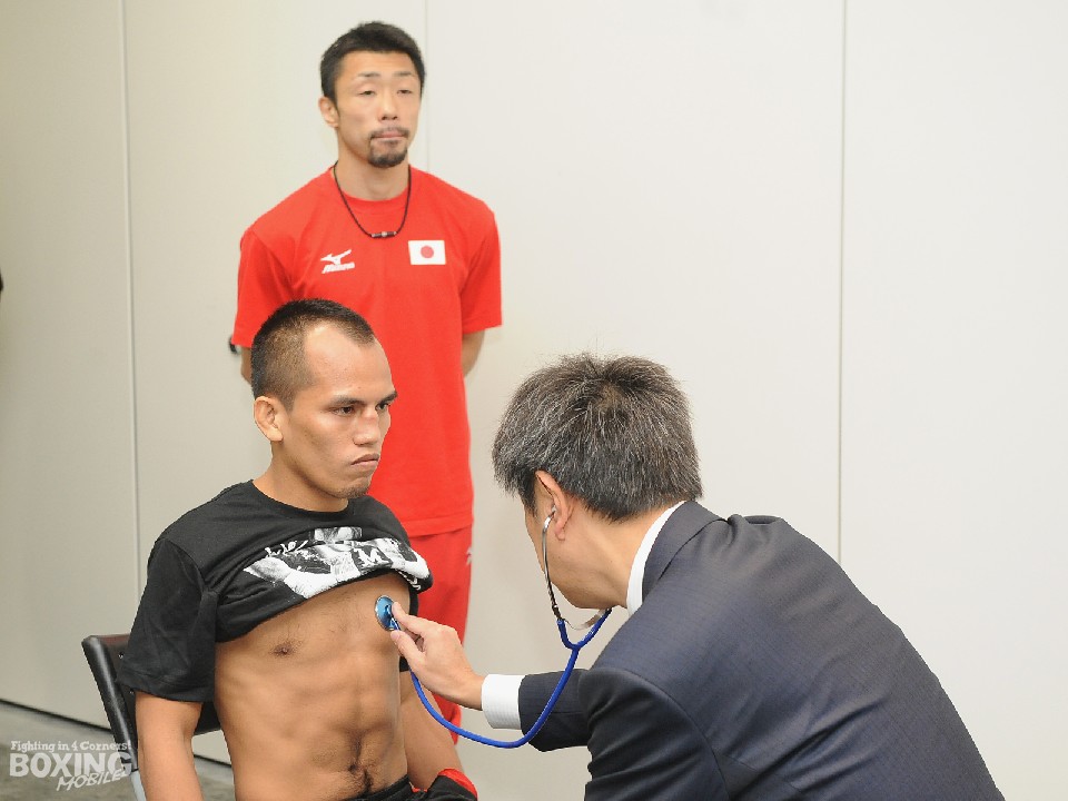 21日(日)の東京・有明コロシアムでIBF(国際ボクシング連盟)ライトフライ級王座統一戦に臨む正規王者の八重樫東(34=大橋)と暫定王者のミラン・メリンド(29=比)が18日、都内の後楽園ホール展示会場で予備検診を行った。暫定王者とフォトセッションで並んだ八重樫は、物静かなメリンドに対し「イメージどおり。オーラは特に感じられない」とコメント。メリンドも「大丈夫。普通の人間だった」と感想を口にした。