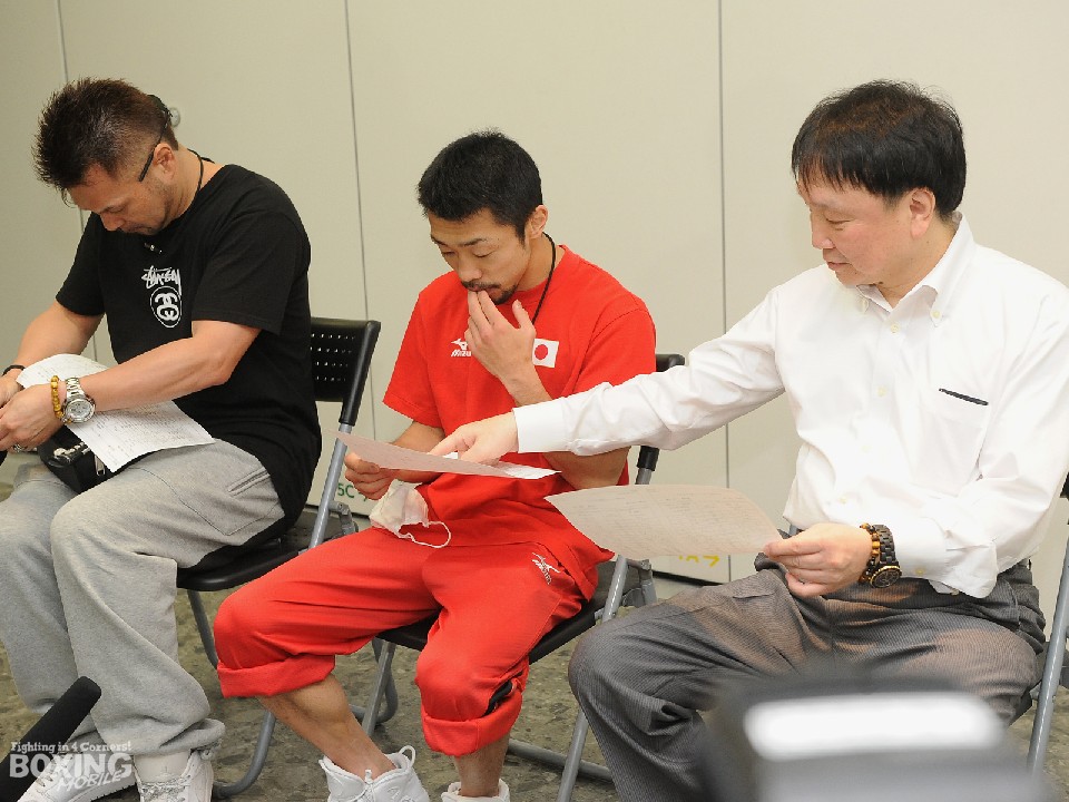 続いて会見が行われ、メリンドより身長で2cm、リーチで1.5cm上回った八重樫は、検診データを見て大きくうなずくと「予想どおり」と満足気な表情を浮かべた。リーチに関しては前回より2.5cm伸びており、大橋秀行会長は肩甲骨まわりを鍛えた成果と喜んだ。