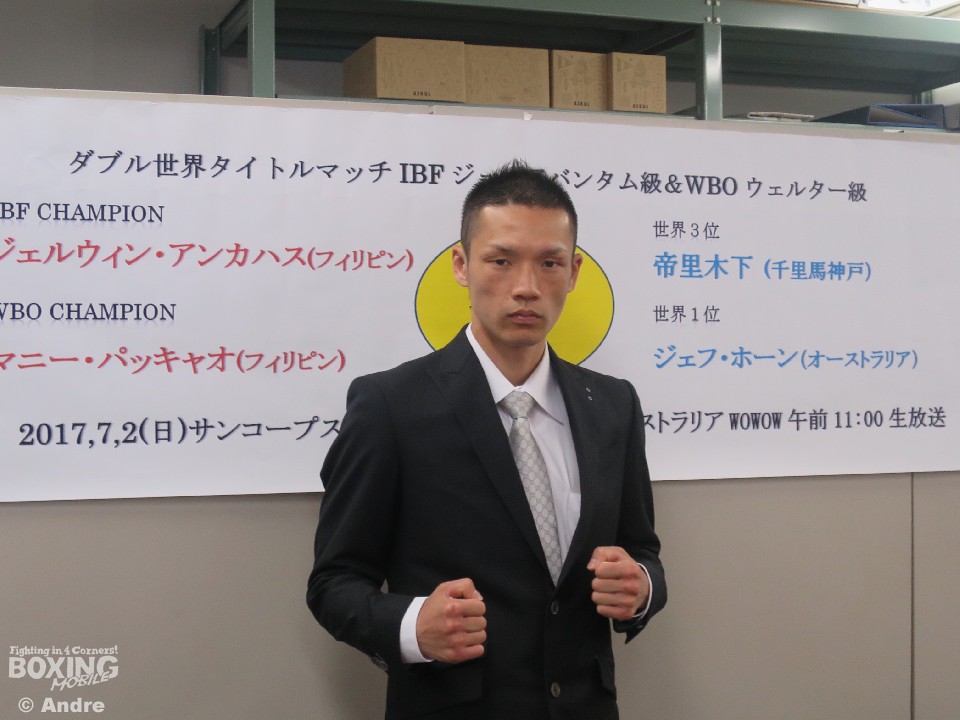 IBF世界スーパーフライ級3位の帝里木下(千里馬神戸)が8日、神戸市役所16階の特設会場で世界戦の発表会見を行った。帝里は、今年1月28日にプエルトリコで当時同級6位のマックジョー・アローヨ(プエルトリコ)と、IBF同級指名挑戦者決定戦に出場を予定していたが、試合直前にアローヨ陣営のプロモーター都合で延期となり世界再挑戦が宙に浮いていた。ようやく本決まりとなった試合は7月2日(日)、オーストラリアのブリスベンでWBO世界ウェルター級王者のマニー・パッキャオ(比)の初防衛戦のアンダーカードとしてIBF世界スーパーフライ級王者のジャルウィン・アンカサス(比)に指名挑戦者として拳を交える。3年ぶりに訪れたチャンスを前に帝里は「必ず獲る」と、意気込みを語った。