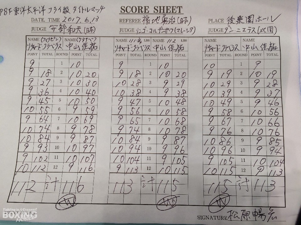 サスウポー中山がフットワークを駆使し、ワンツー、左ボディでペースを握った。クラベラスはプレスをかけて反撃するが、動き回る中山についていけず。中山が優勢に見えたが4ラウンド終了時の公開採点は38-38、39-37でクラベラス、40-36で中山とそれぞれ割れた。中盤、クラベラスは右ストレートから接近戦に持ち込むが、真っ向から受けて立った中山は回転力で上回りロープに詰めて連打でダメージを与えた。8ラウンド終了時の公開採点は1者が76-76としたが2者は78-74で中山がリード。劣勢のクラベラスは圧力を強め左フックで逆転を狙ったが、中山は最後まで足を止めることなくメリハリのある攻撃を見せた。採点は割れたが中山の有効打が評価され新チャピオンに輝いた。