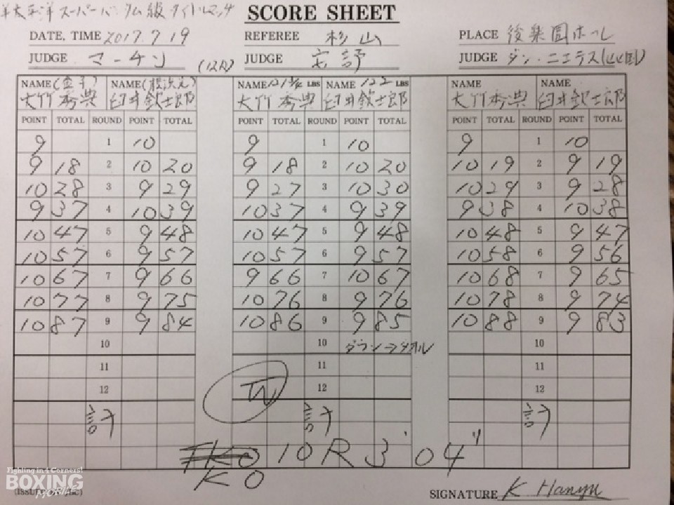 エンジンの掛かりが遅い大竹だったが、キレのある左フックで応戦すると2回は先手を意識し、臼井の懐に飛び込んでは左ボディを効かせた。それでも序盤は臼井の返しが光り、4回終了時の採点を38-38、39-37、39-37の2-0でリード。後れをとった王者は圧力を増し巻き返しを図るが、挑戦者も被弾しながら左フック、右ストレートをよく返し、流れを変えさせなかった。しかし、6回に入るといよいよ馬力に差がつき、強烈なボディ、フックで徐々に臼井の足が止まった。8回終了時は76-76、77-75、78-74と大竹が逆転。終盤は大竹がさらにギアを上げ打って出るが、臼井も手薄になったガードのスキに右をねじ込み、執念を見せた。壮絶な打ち合いに2000人を詰め込んだホールは大いに沸き、一打一打に悲鳴と歓声が飛び交うなか10回、いよいよ大竹の猛打に臼井が耐えきれなくなり、終了間際にボディを抉られ遂にダウン。同時にセコンドからタオルが投入された。