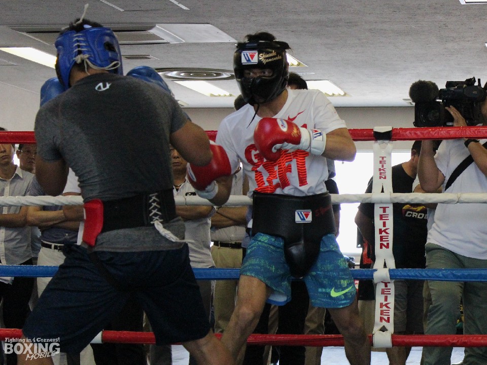 会見後には、ネリ陣営が偵察する中、IBFユース・スーパーフライ級王者で8戦全勝(5KO)のジェイド・ボルネア(フィリピン)と2ラウンドのスパーリングを披露。伸びのあるジャブを再三ヒットすると、左ストレートをボディに決めて相手を懐に入らせなかった。短いラウンドにもかかわらず、山中の圧力でボルネオは息が上がっていた。