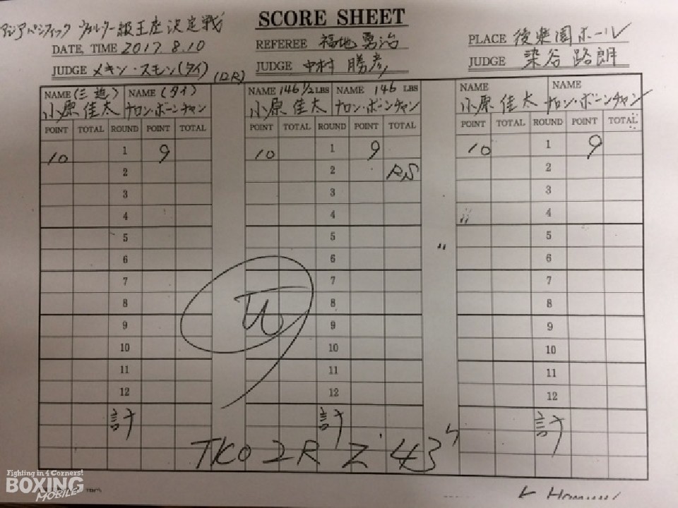 見事なKO勝利でベルトを巻いた小原は「初回は距離をキープしようとしたが、緊張もあって下がらされた。ただ、課題に挙げていた焦らず攻めることができた。これで世界への夢が再び歩めたかなと思う」と冷静に試合を振り返った。「世界戦を経て海外の選手は予想以上のプレスやパンチの伸びがあると思った。上の階級の選手とスパーリングをして実力を上げていきたい。海外で勝ち星がまだないので戦っていきたい」とさらなる飛躍を誓った。