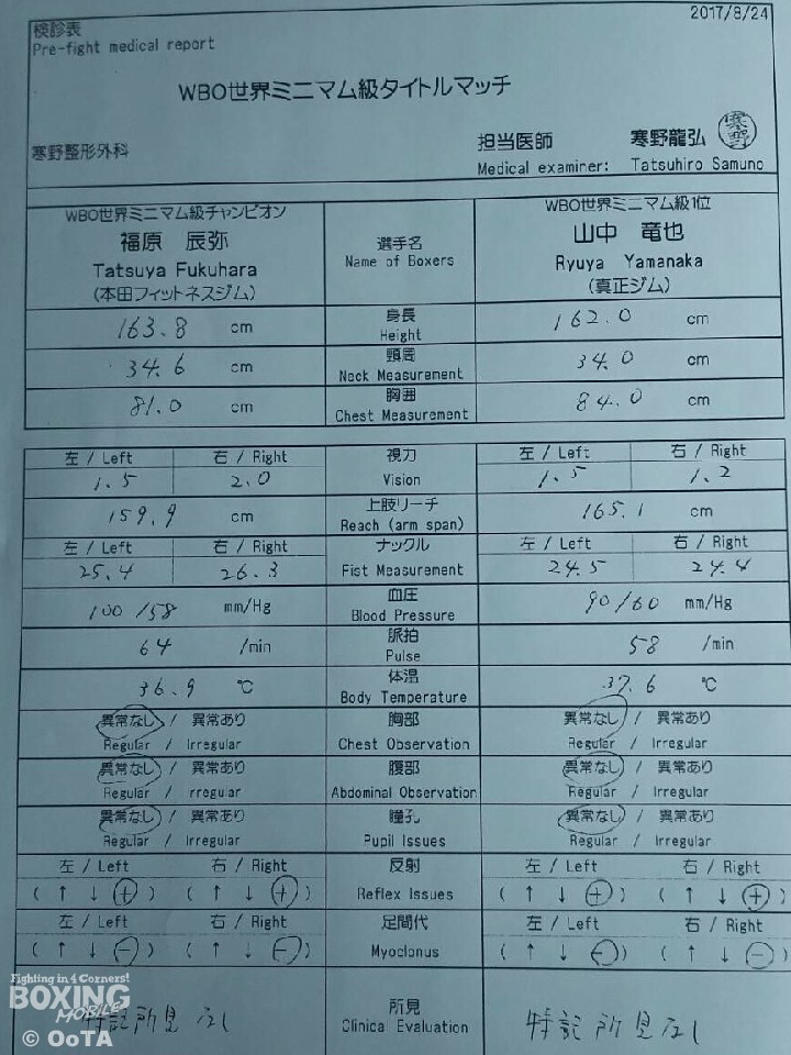 日本人対決で注目を集めているWBO世界ミニマム級世界戦の予備検診が24日、試合が行われる熊本市内の病院で行われた。地元出身の世界チャンピオン福原辰弥(本田F)と挑戦者で神戸から乗り込んできた山中竜也(真正)は落ち着いた様子で検診を終えた。