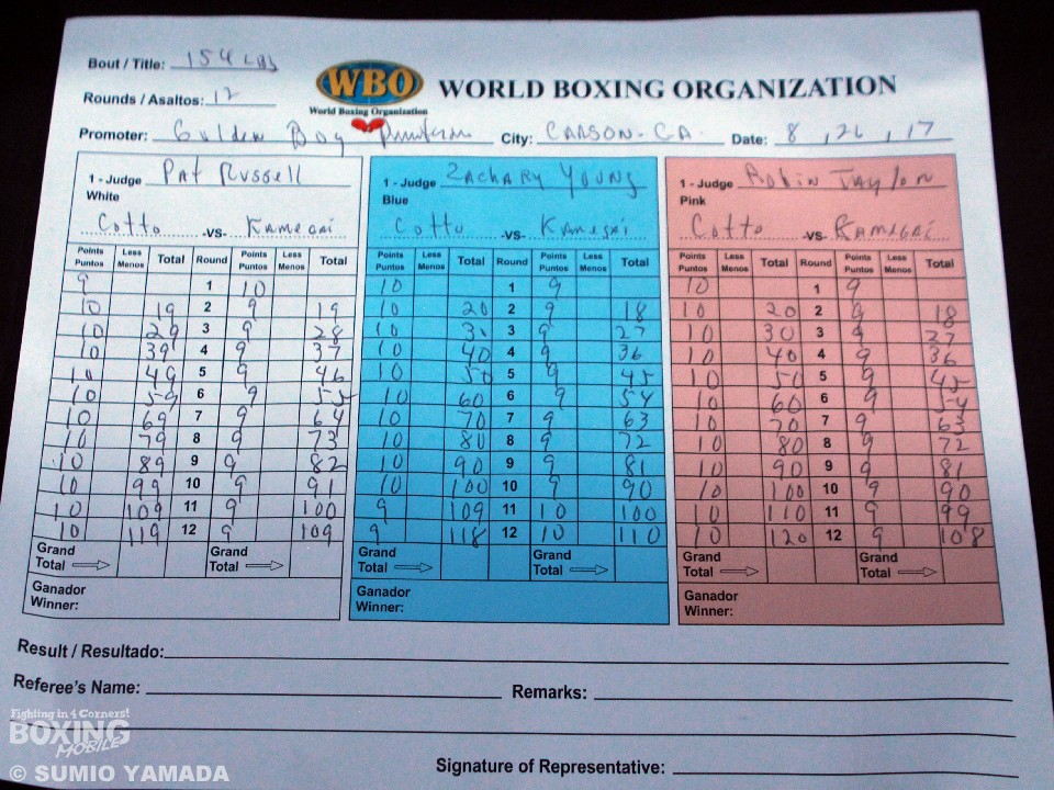 採点は120対108、118対110、119対109と大差がついた。スーパーウェルター級では2度目の王座についたコットは46戦41勝(33KO)5敗。敗れた亀海は33戦27勝(24KO)4敗2分。