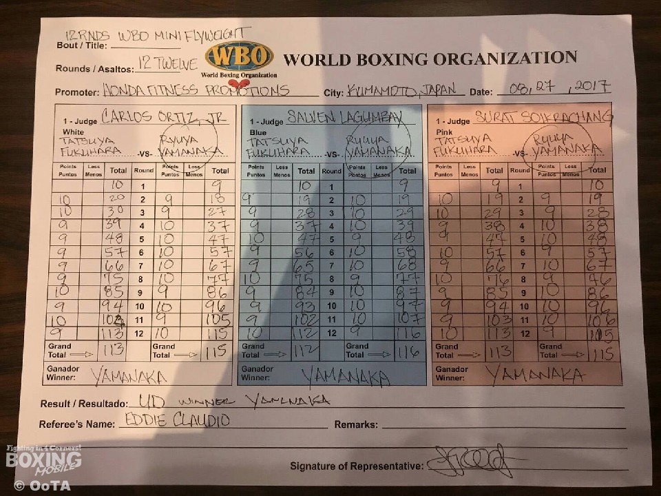 試合は、ノーモーションの左を上下に散らし、距離を詰めては右ボディを強振するサウスポーの福原に対し、山中がジャブでリズムよく動き距離を意識しながら多彩な右を当てにいった。5回、福原は山中の右でグラつきピンチに陥ったが、体をつけながら回転の速いボディを打ち込み切り抜けたが、その後は左フックからボディを狙う山中にペースを奪われた。徹底してボディを狙う福原もプレスを強めるが、山中は左フックで迎え撃ち、右アッパーで福原のアゴを跳ね上げた。せめぎあいは最終回まで続き、山中が左フックから右アッパーを打ち込めば、福原も接近してのボディ連打で対抗したがゴング。勝負の行方は判定に委ねられ、ジャッジ3者の支持を得た山中に軍配があがった。