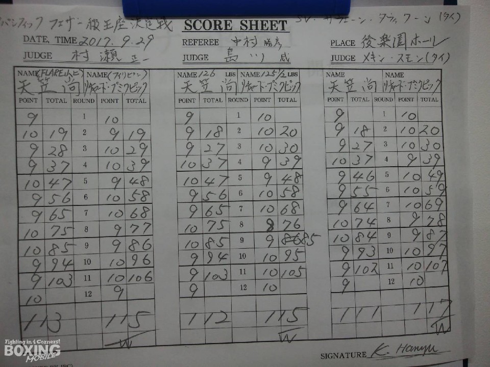 いつもの立ち上がりの遅さを突かれた天笠は左を突いて回避したいが、スピード差から左フックの被弾が目立つ。調子が上がらないままラウンドが進み、5回にようやくジャブから距離を詰めての左ボディ、右クロスで攻勢に転じた。8回には左ボデイの好打から一方的に連打で追い込むと、9回も距離を活かしポイントを奪ったが、10回はスタミナを回復させたプミクピックに攻め手を欠き、突破口を見つけられないまま終了のゴングを聞いた。
