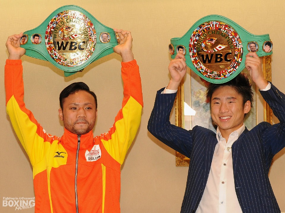 挑戦者トマ・マソン(仏)を左フックで倒し、7回TKO勝ちでWBC世界フライ級王座の初防衛に成功した比嘉大吾(22=白井・具志堅)が23日、都内のホテルで一夜明け会見を開いた。同じ沖縄出身の元WBC世界スーパーライト級チャンピオン浜田剛史氏が持つ、15連続KO記録まであとひとつと迫った比嘉は、「浜田さんの前で言いづらいが、記録を抜けたら嬉しい」と意欲を見せ、会見場で後輩を見守った浜田氏も「沖縄を盛り上げるためにも頑張ってほしい」とエールを送った。