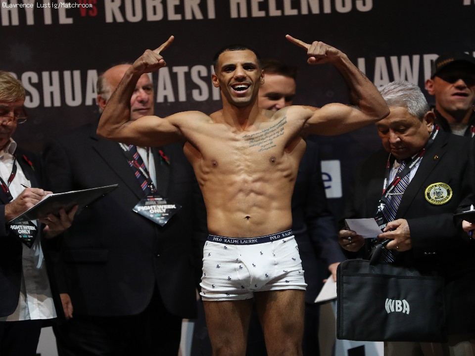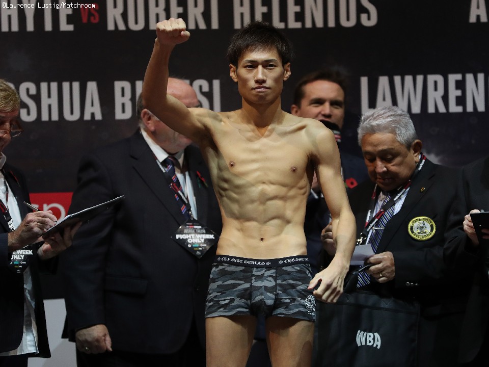 明日、WBA世界スーパーフライ級タイトルマッチで拳を交えるチャンピオンのカリド・ヤファイ(英国)と挑戦者で同級1位の石田匠(井岡)が揃って前日計量を行なった。先に秤に乗った石田は51.8kgの300gアンダーでパス。一方、チャンピオンのヤファイは52.1kgのリミットで秤を降りた。