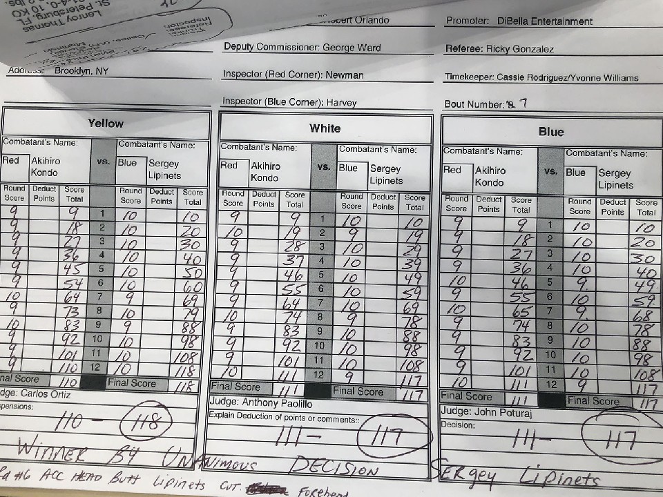 試合はリピネッツが強いジャブを軸に序盤から距離を意識して戦い、主導権を掌握。プレッシャーをかけ続けた近藤も、打ち下ろしの右を効かせる場面はあったが、攻撃が続かず明確なポイントには結びつかなかった。判定は117-111×2、118―110の3-0でリピネッツに軍配が上がり、テレンス・クロフォード(米)が8月に返上して空位になった王座を獲得した。戦績13戦全勝(10KO)。近藤は37戦29勝(16KO)7敗1分。