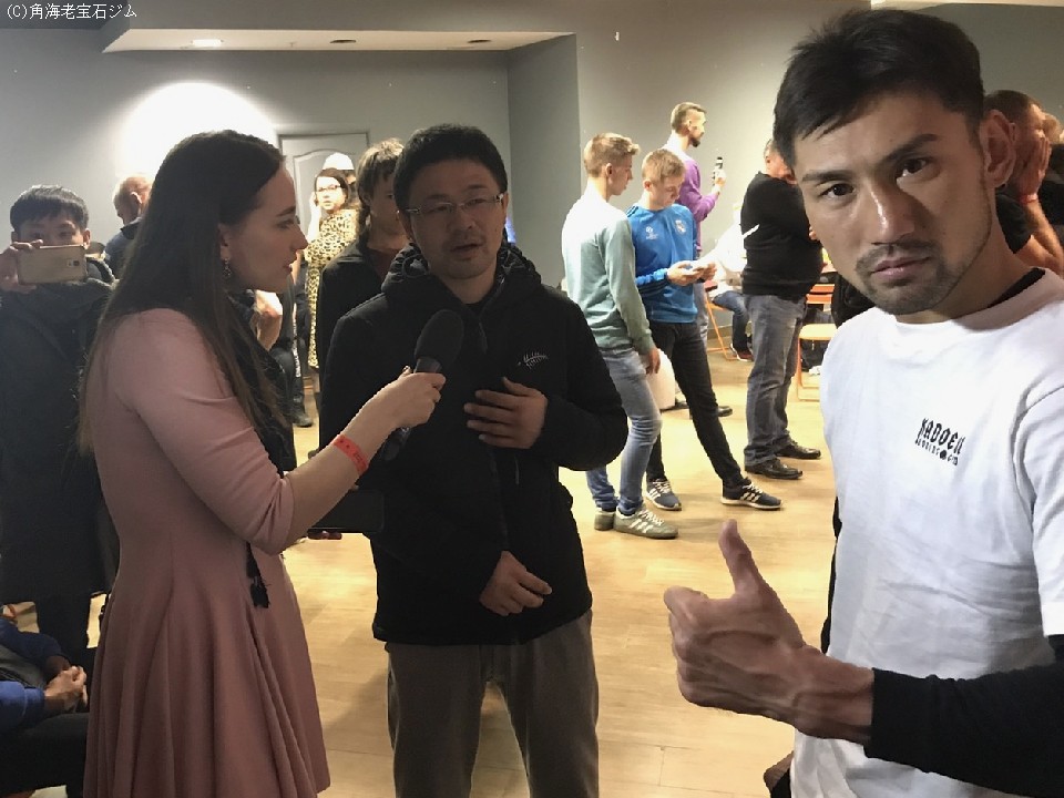 取材を受ける小堀トレーナー 実は英語が堪能