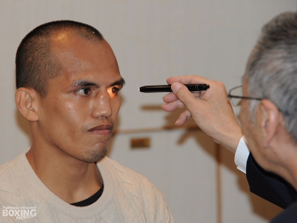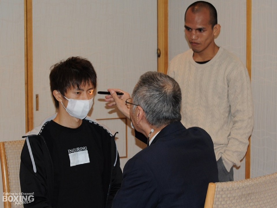 大晦日に東京・大田区総合体育館で開催されるトリプル世界戦のメインイベントに出場するWBA(世界ボクシング協会)ライトフライ級王者の田口良一(31=ワタナベ)が29日、都内のホテルで予備検診を受けた。田口はIBF(国際ボクシング連盟)同級王者のミラン・メリンド(29=比)と王座統一戦に臨む。田口が苦笑いしたのは、検診後の写真撮影時。WBA王者に近づいたメリンドの見せた意外な一面が報道陣の笑いを誘った。