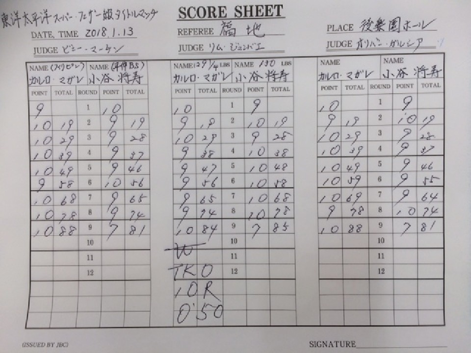小谷はマガレの強力なフックを巧みにかわして右ストレートをヒット。しかし、ガードを固めジャブから左ボディを繰り出したマガレの攻撃にダメージを負った。中盤、守勢を強いられた小谷は右を返し反撃を試みたが、挽回するまでには至らず。9回、マガレは左アッパーから右フックで先制のダウンを奪うとラウンド終了間際に右でダウンを追加した。10回、勝負をかけた小谷だったが、マガレの連打を浴びるとレフェリーが割っ