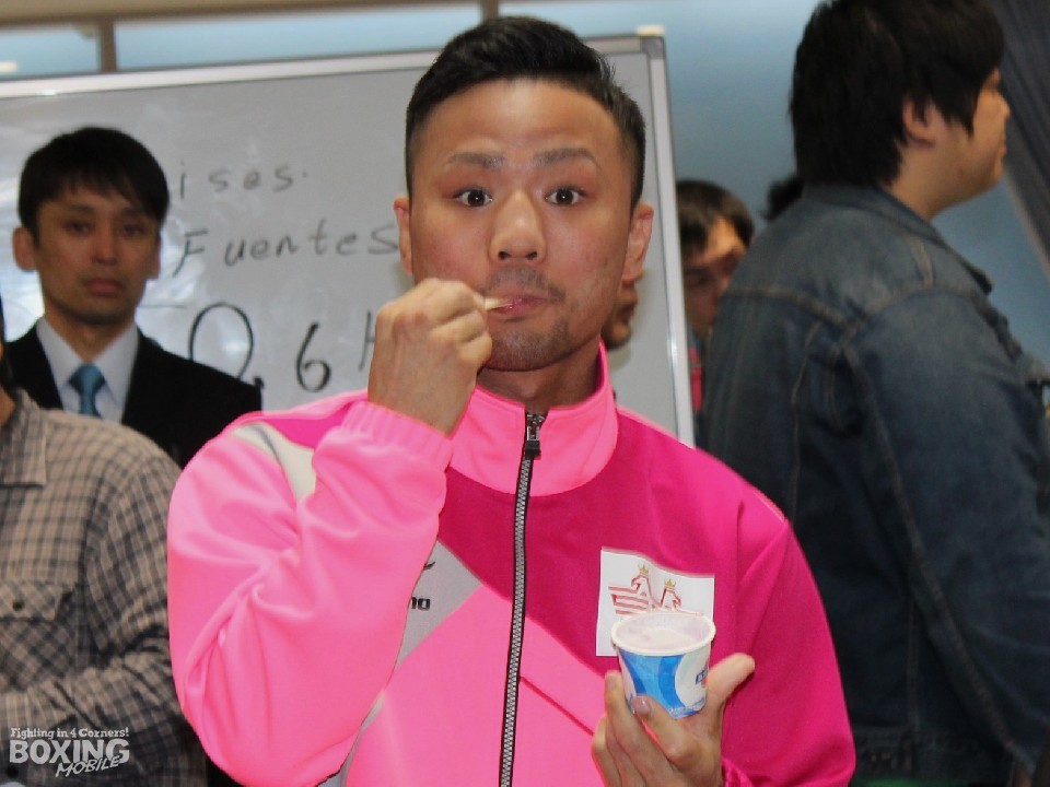 リミットいっぱいの50.8kgでパスした比嘉。計量後には、かつて具志堅会長が試合前に食べていたというアイスクリームを口に運びニッコリ。毎回飲んでいる地元・沖縄の名産の「黒あまざけ」、さらにすっぽんスープを飲み干し疲労回復に努めた比嘉。「計量までが長くてクリアした後は試合に向けてあっという間なので100%の状態にしてしっかりKOで勝ちます」と闘志を燃やした。