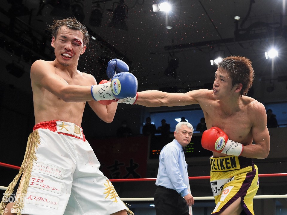 被弾の多い大里は左目上が腫れ上がりながらも懸命に追うが、迎撃体勢に入った王者の懐は深く、スピードでも差が開いてしまう。終盤はほぼ完全に左目が塞がり、挑戦者は気持ちだけは前を向くも劣勢は明らかだった。すると8回、右ストレートで内出血した箇所が切れたところで2度目のドクターチェックが入り、レフェリーは続行不能と判断。ジムの先輩でもある尾川堅一が返上した王座を昨年10月の決定戦を制して引き継いだ末吉が8回TKO勝ちを飾り、初防衛に成功した。