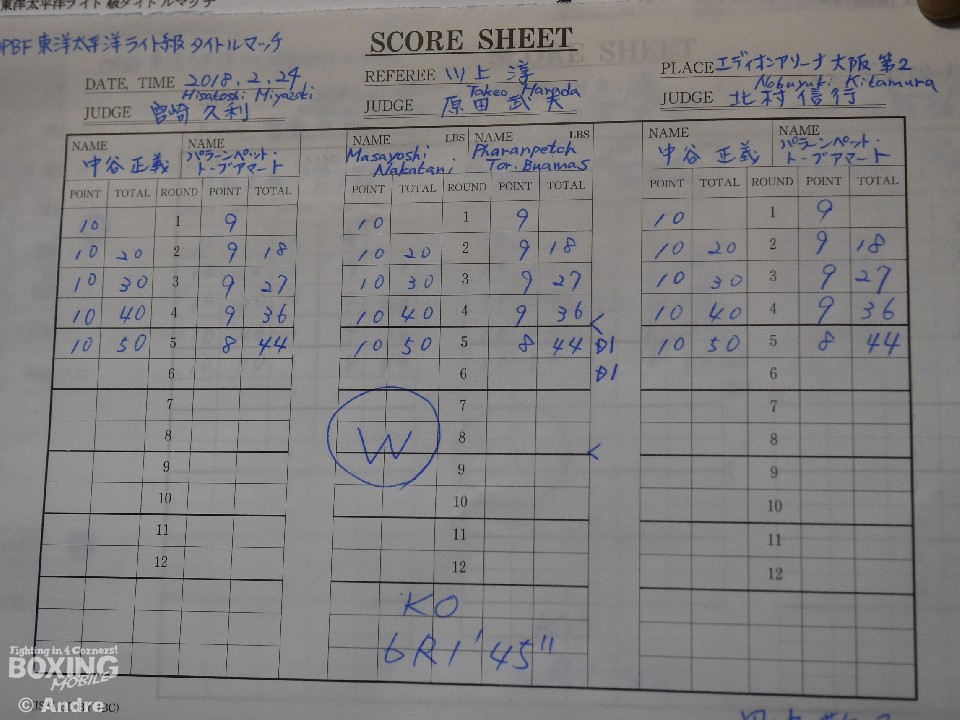 試合は、チャンピオンの中谷が距離を生かし完勝。序盤からジャブで距離を掌握した中谷はジャブを上下に散らし、ポイントを重ねる。対して、パラーンペットは右のオーバーハンドで起死回生の一打を狙うが中谷には当たらず。すると6ラウンド、パラーンペットが踏み込んだ瞬間中谷のボディが決まりパラーンペットが悶絶の表情でダウン。そのままカウントアウトで中谷が9度目の防衛戦を見事なKOで決めた。