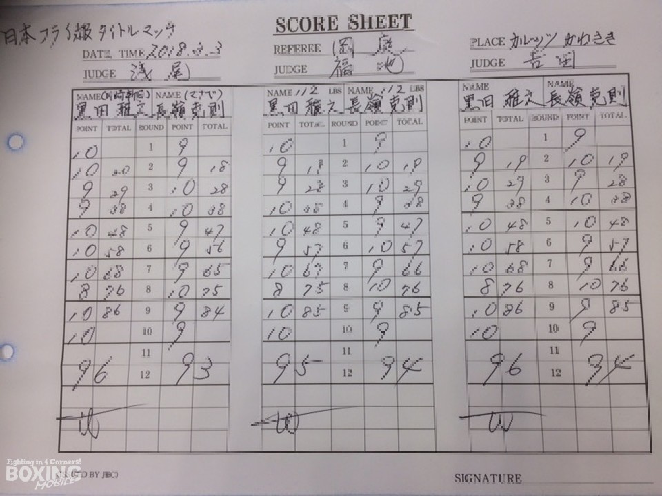 前半は黒田がジャブで試合を組み立てるのに対し、長嶺は打ち終わりに右ストレート、左フックを合わせ互角の展開。前半終了時の公開採点は48-48×1、48-47×2でわずかにチャンピオンがリードした。その後も中間距離でパンチを交換していたが、黒田の鋭いパンチで長嶺の右目下が内出血で腫れた。しかし8回に長嶺の右フックがジャストミートし値千金のダウンを奪った。ラスト2ラウンドは黒田の手数が勝り攻勢をアピールし、試合終了のゴングを聞いた。ジャッジは3者ともに黒田を支持し2度目の防衛に成功した。