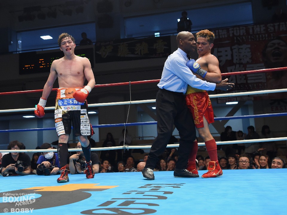キレのある動きから力強いジャブ、右ストレートで好スタートを切った伊藤は、2回にボディに左を刺しダウンを奪った。早くもKOの期待が高まり、以降も抜群のコンビネーションで攻め立てるが、中盤以降は瀕死のはずのプトンが息を吹き返し、なりふり構わず強打を連発。伊藤はペースこそ握り続けたが、攻めあぐねる場面が増えた。それでも7回にボディを効かせ2度目のダウンを奪うと、9回に連打で倒しレフェリーストップを呼び込んだ。