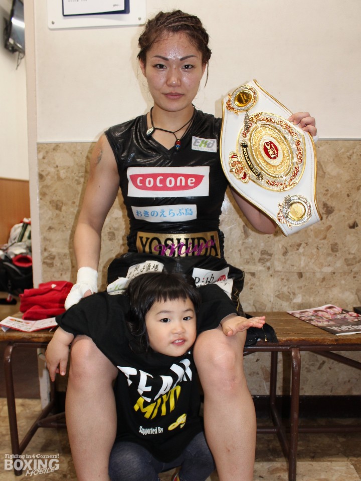 控室に戻ると2歳の長女・実衣菜ちゃんに迎えられた吉田は笑顔を見せた。「課題は残ったが、防衛するのが最低条件だったのでベルトが戻ってきてうれしい」と声を弾ませたが、「思ったより相手に低く入ってこられてやりずらかった。もっとコンビネーションを出したかった」と反省するのも忘れなかった。会見後には実衣菜ちゃんにジュースをおねだりされた吉田はファイターから母親の顔に戻っていた。