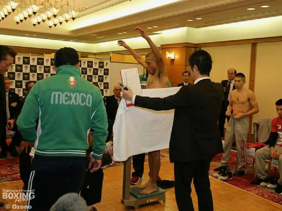 WBO世界ミニマム級タイトルマッチの前日計量が17日、神戸市内のポートピアホテルの特設会場で行われた。チャンピオンの山中竜也(真正)と、同級4位のモイセス・カジェロス(メキシコ)計量はリミットでパス。11時に行った予備の計量で400gオーバーと周囲を心配させたカジェロスだが、本番はきっちりリミットで秤を降りた。