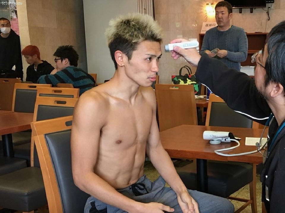 一方、A級初戦でタイトル戦となった馬庭は200gアンダーの55.1kgで合格。計量を終えた馬庭は「僕にはツキがある。初の8回戦の試合で初のメインイベントで初のタイトルマッチ。敵地は関係ない。明日は普通にやれば倒して勝てる。名古屋を観光して帰ります」と気を吐いた。