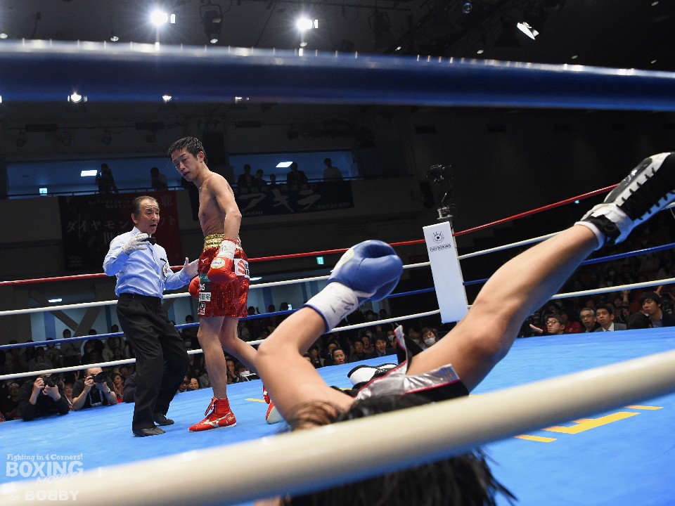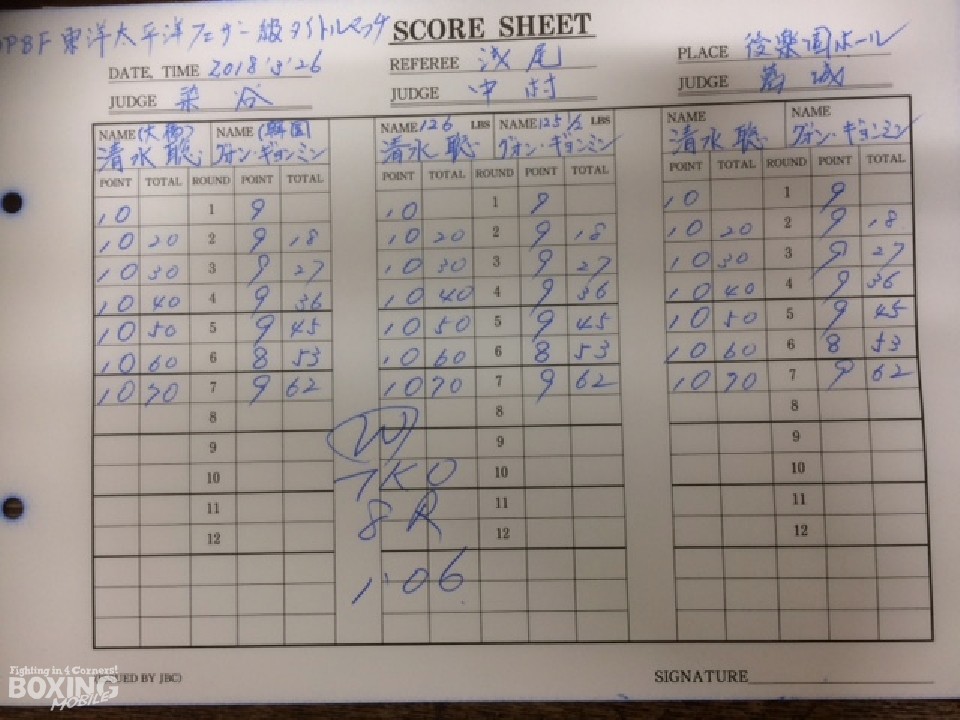 長身のサウスポー王者が右ジャブを散らしワンツー、ボディで攻め続けたが、タイトル初挑戦のグォンは予想以上に粘り、中盤までに清水の打ち疲れを誘う形となった。それでも左ストレート、右アッパーを効かせ続けた清水は、6回に左のカウンターでダウンを奪うと、8回にコーナーで連打を浴びせフィニッシュ。レフェリーストップを呼び込み、2度目の防衛に成功すると同時に、パーフェクト記録を6に伸ばした。