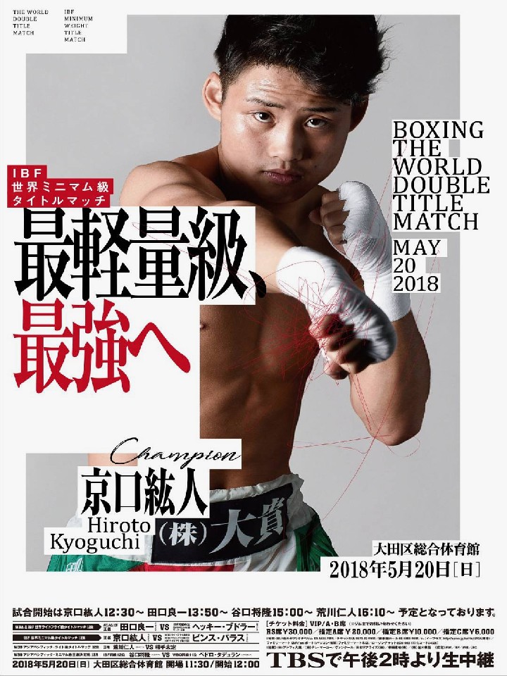 また、この日は他に予備カードを含め6回戦が2試合、4回戦1試合が組まれ、計7試合で予定されているが、日曜日の正午スタート、TBS関東ローカルで午後2時からの放送とあって、昨年度全日本フェザー級新人王の佐々木蓮(23)の6回戦が第1試合に行われ、以降、京口のIBF防衛戦、田口の統一王座防衛戦、谷口のWBOアジア戦、荒川のWBOアジア防衛戦の試合順で行われることも伝えられた。