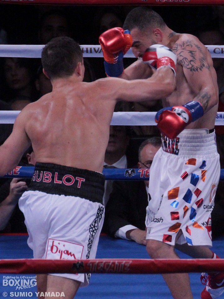 ゴロフキン対マーティロスヤンの試合にはIBF王座はかけられなかったが、それは重要なことではない。ここはゴロフキンが初回に隙をみせながらも2回に痛烈なダウンを奪ってKO勝ち、通算20度目の防衛を果たしたことにこそ注目すべきだろう。緩やかな衰えを感じさせはしたが、久しぶりにハンマーのような豪打によるKO勝ちだった。敗れたマーティロスヤンは試合後、「一発のパンチだけではなく、すべてのパンチが強かった。あんなパンチはこれまで受けたことがない。この試合に備えてヘビー級やクルーザー級の選手ともスパーリングをしてきたが、それと同じパワーを感じた」と脱帽の様子だ。正面突破を狙ったことについては「コーチからは『もっと右に動け』と言われ、別のプランもあったのだが、ゴロフキンに何ができるのか知りたかったんだ。だから中に入っていった。彼は強かった。ホンモノだ」と自らの完敗とV20王者の実力を認めた。