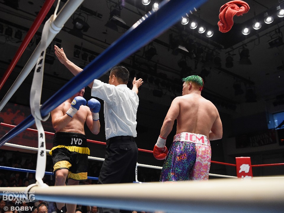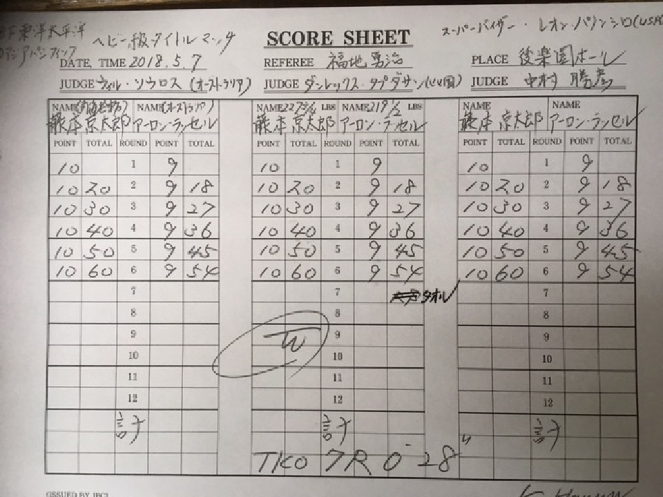 丁寧にジャブを繰り出した藤本はワンツーを好打。さらにボディにもパンチを集めラッセルを後退させた。4ラウンド終了時の公開採点は3者ともに40-36で藤本がリード。中盤もロープに詰めてコンビネーションを決めたが、気を抜いたところにラッセルのパンチを浴びる場面もあった。それでも流れを渡さずダメージを与えていくと、7回に相手陣営からタオルが投げ込まれた。