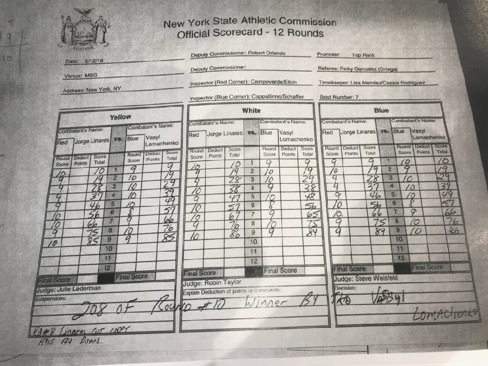 史上最速の12戦目で3階級制覇を成し遂げたロマチェンコは11勝(9KO)1敗。これで8連続KO勝ちとなった。敗れたリナレスは48戦44勝(27KO)4敗。9回終了時点の採点は三者三様で、ひとりが86対84でリナレス、もうひとりは逆に86対84でロマチェンコ、残る一者は85対85のイーブンだった。
